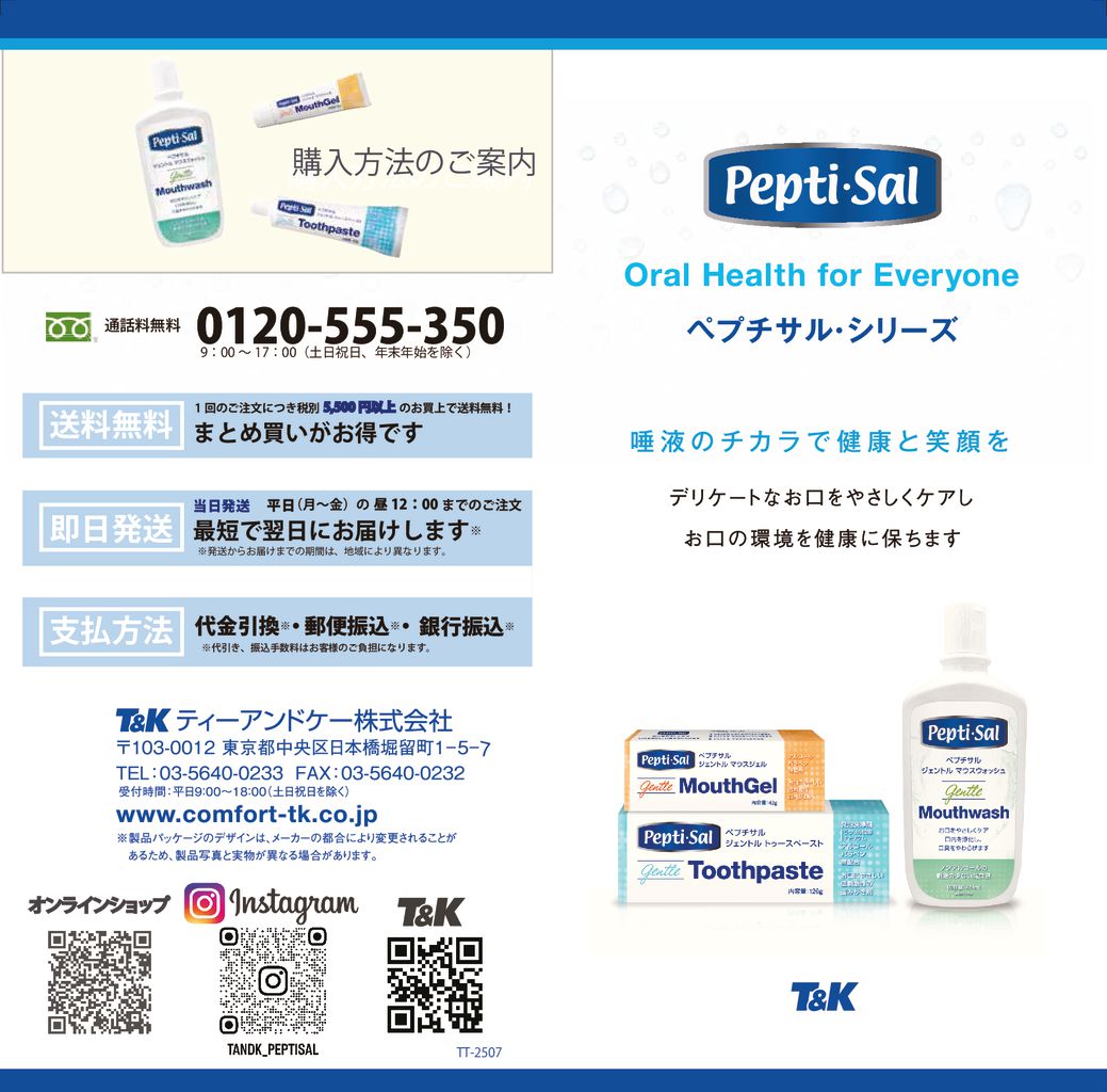 製品の情報医療関係者向け2026/03/31 ペプチサル・シリーズの使い方冊子 この資料を見る(PDF)> この資料・動画の主な内容 唾液のチカラで健康と笑顔を 資料ライブラリ・カテゴリ 口腔ケアの情報 患者さん向け 医療関係者向け 患者さん/医療関係者向け 製品の情報 患者さん向け 医療関係者向け 患者さん/医療関係者向け T&K動画 患者さん向け 医療関係者向け 患者さん/医療関係者向け よく読まれている記事 口腔アセスメントガイド(OAG)Eilers Oral Assessment Guide(OAG)/口腔ケア プロトコール例 口腔乾燥を引き起こしやすい薬剤リスト700種類以上のお薬が口腔乾燥を引き起こす可能性があります/添付文書に口腔乾燥が報告されている主な薬剤 ・・・・ シェーグレン症候群患者さんのドライマウスのケアシェーグレン症候群とドライマウス/唾液のはたらき/保湿グッズで口内にうるおいを/唾液の分泌を促進するために ・・・・ 口腔機能&口腔乾燥唾液腺マッサージ/嚥下障害と誤嚥性肺炎 口腔内常在菌のコントロール・バイオフィルム抑制効果バイオフィルムとは/バイオフィルムはどのように作られるのか/口腔の常在菌に対する効果/バイオフィルムに対する効果 ・・・・ 資料ライブラリトップへ >