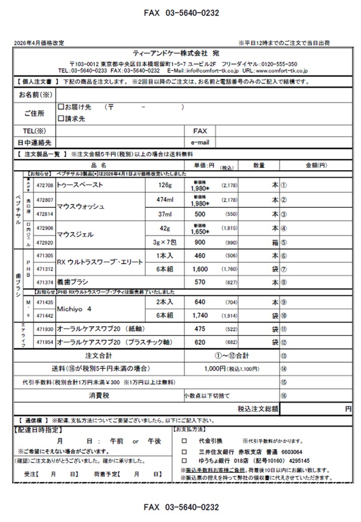 患者さん向け2026/04/09 注文用紙/個人用(税別) この資料を見る(PDF)> 資料ライブラリ・カテゴリ 口腔ケアの情報 患者さん向け 医療関係者向け 患者さん/医療関係者向け 製品の情報 患者さん向け 医療関係者向け 患者さん/医療関係者向け T&K動画 患者さん向け 医療関係者向け 患者さん/医療関係者向け よく読まれている記事 口腔アセスメントガイド(OAG)Eilers Oral Assessment Guide(OAG)/口腔ケア プロトコール例 口腔乾燥を引き起こしやすい薬剤リスト700種類以上のお薬が口腔乾燥を引き起こす可能性があります/添付文書に口腔乾燥が報告されている主な薬剤 ・・・・ シェーグレン症候群患者さんのドライマウスのケアシェーグレン症候群とドライマウス/唾液のはたらき/保湿グッズで口内にうるおいを/唾液の分泌を促進するために ・・・・ 口腔機能&口腔乾燥唾液腺マッサージ/嚥下障害と誤嚥性肺炎 口腔内常在菌のコントロール・バイオフィルム抑制効果バイオフィルムとは/バイオフィルムはどのように作られるのか/口腔の常在菌に対する効果/バイオフィルムに対する効果 ・・・・ 資料ライブラリトップへ >
